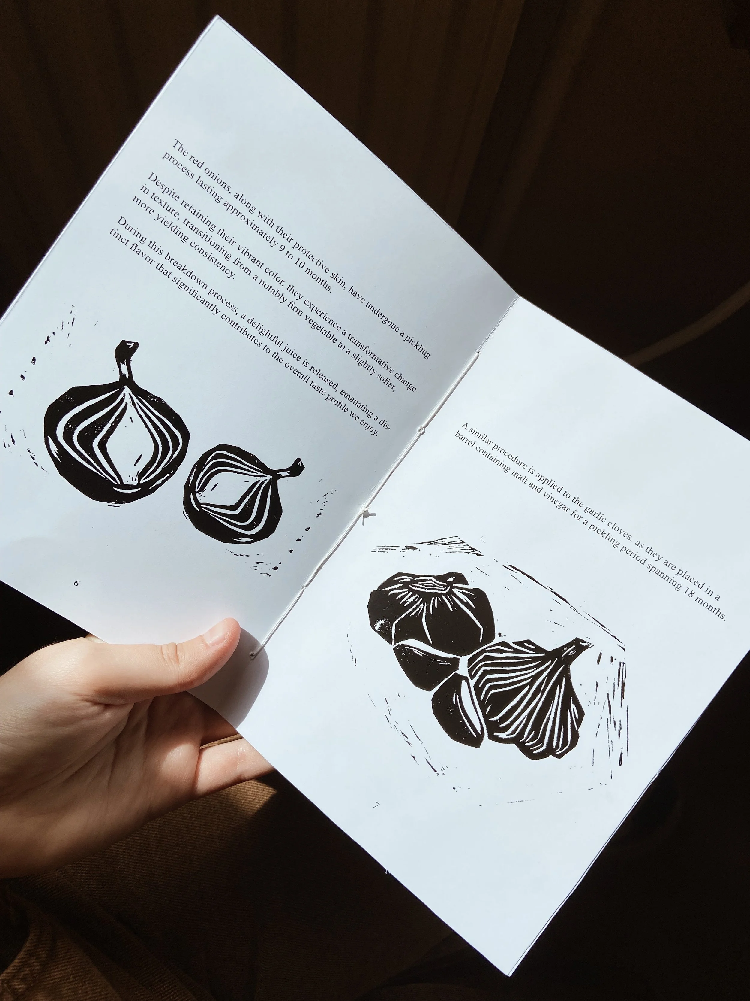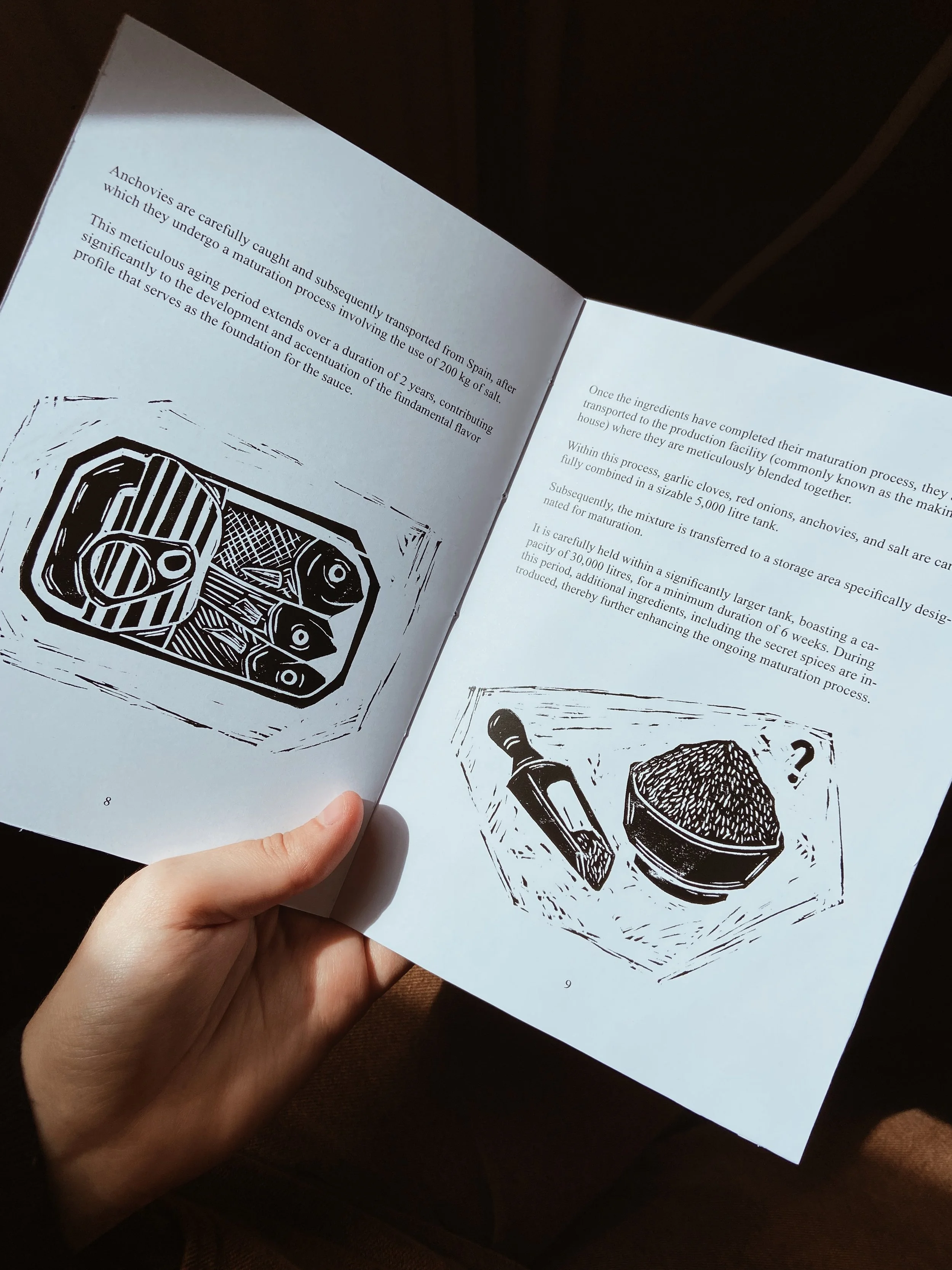 Creació d’un recetari il·lustrat de la salsa Worcestershire. Il·lustracions fetes a partir de la tècnica de linogravat i posteriorment digitalitzades. Maquetació feta amb inDesign i enquadernació manual. Sèrie de cinc còpies.